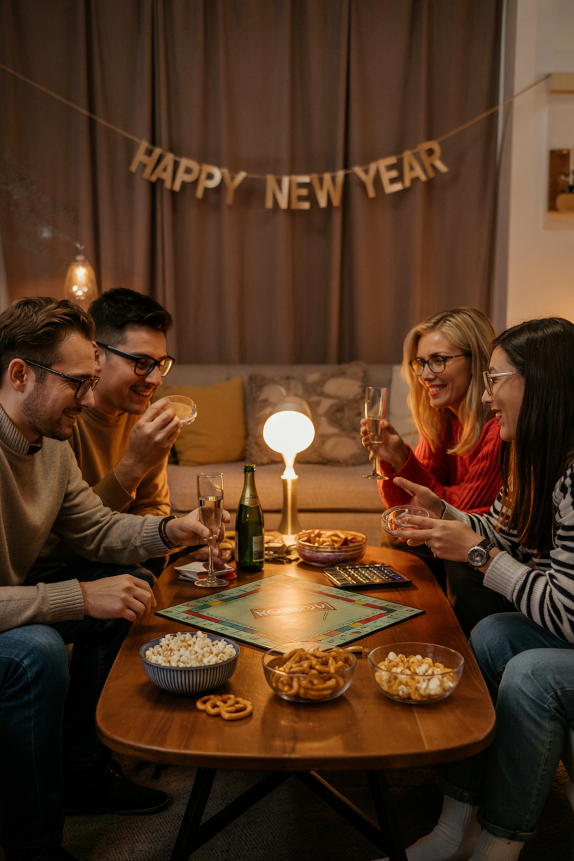 Turn your living room into a game show for New Year’s Eve! Create unique games inspired by classics like “Family Feud”, “Jeopardy”, and “Wheel of Fortune”, with a NYE twist.