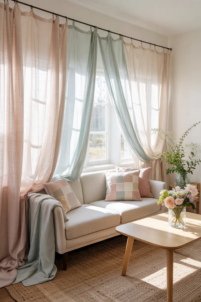 In order to accomplish an ethereal atmosphere, choose materials in soft whites or barely-there pastels. The smooth movement of sheer curtains gives a dynamic aspect to your living room while keeping privacy.