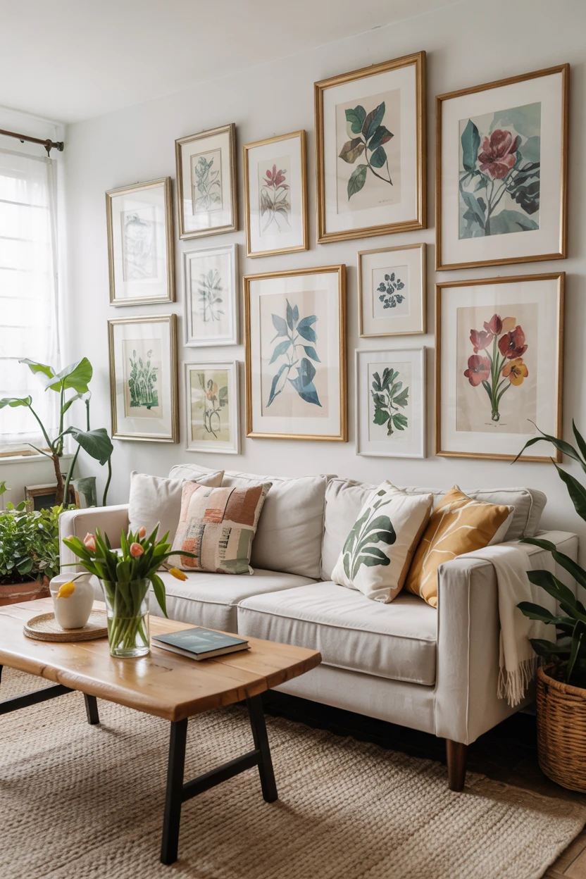 Choose items with soft-focus floral pictures or outstanding botanical graphics. Create a gallery wall that blends various sizes and styles while sticking to a common theme.