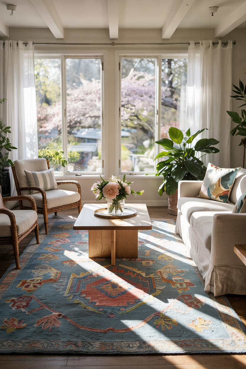Use a vibrant area rug as the foundation of your spring living room décor.