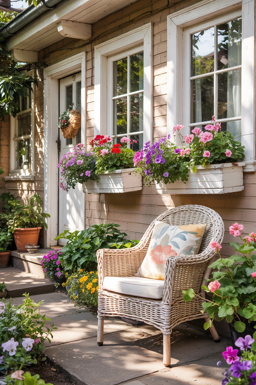 Place medium-height flowers in the center, trailing plants like sweet alyssum in the front, and spiky plants like ornamental grass in the back. I find that white window boxes look fresh and crisp against any house color.