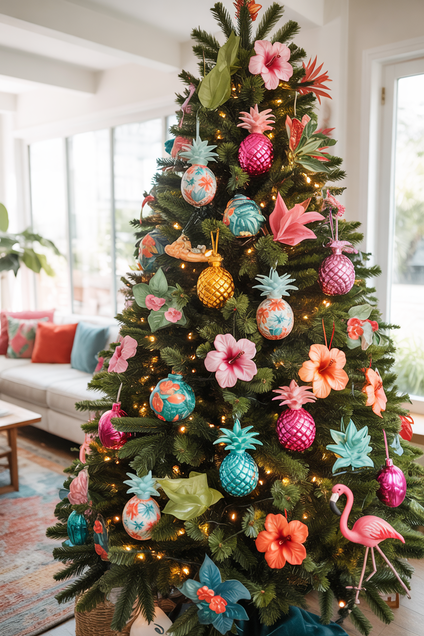 Who says Christmas trees have to be traditional and all about winter? Bring some tropical vibes with palm tree ornaments, pineapples, and bright, sunny colors. Perfect for a warm holiday dream.