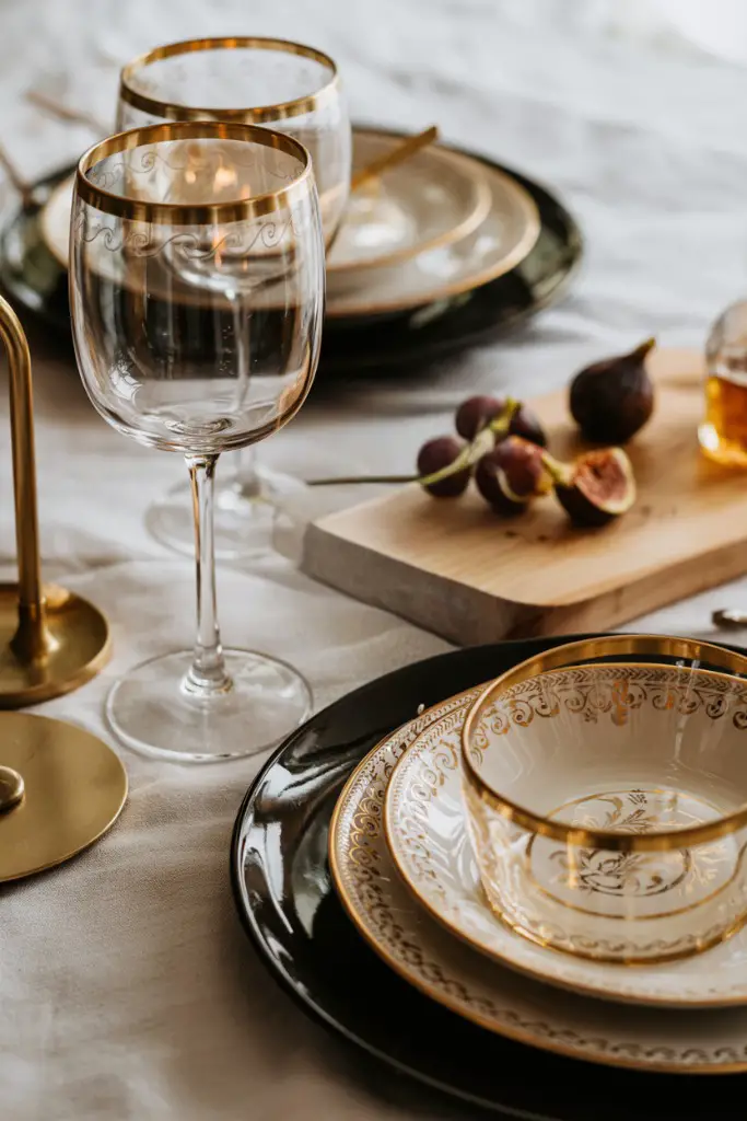 Black chargers paired with gold-rimmed glasses create instant glamour that makes everyone feel fancy. Add brass candlesticks for extra sparkle.